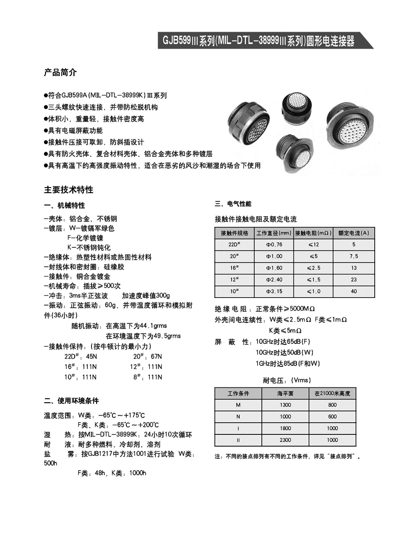 ,符合GJB599AIII系列的要求,采用三頭螺紋快速連接,并帶防松脫機構,與GJB599AII系列產品想反,適合惡劣的風沙和潮濕的場合下使用。