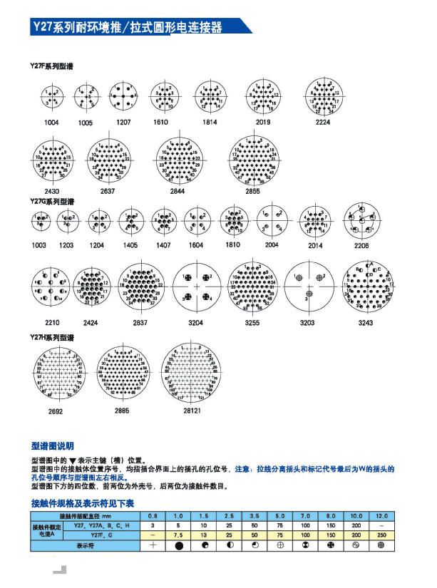 Y27G圓形推拉防水電連接器,采用推/拉式鎖緊機構; 連接可靠,連接和分離方便、快捷,適用于盲目插合或其它插合情況; 具有抗振動、防鹽霧、防電磁干擾、防塵、防雨及氣體密封等性能; 共有13 種殼體號,1~121 等18 種芯數,有3~250A 等10 種電流規格; 材料為鋁合金、海軍黃銅和不銹鋼三種; Y27F、G、H 系列電連接器適用于艦船環境,具有防水密封的性能; Y27H 系列電連接器采用雙曲線插孔; 符合國家軍用標準GJB2905-97,性能參照美軍標MIL-C-38999。http://www.xinchunsheng.com/Product/dadianliuhangkongchatoudianlianjieqi/