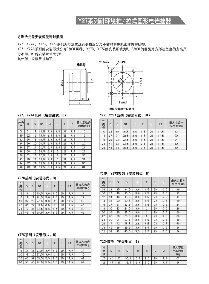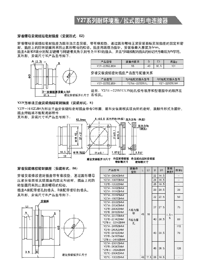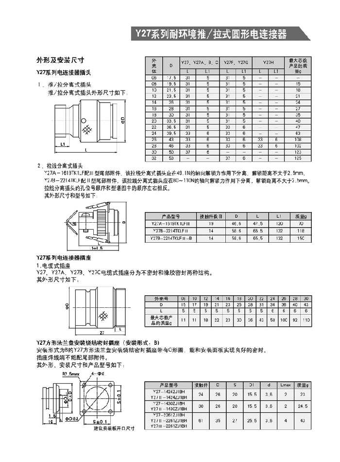 Y27系列耐環境推/拉式圓形航空插頭 ,采用推/拉式鎖緊機構,材料為鋁合金、海軍黃銅和不銹鋼三種,共有13種殼體號,1~121等18種芯數,有3~250A等10種電流規格。Y27A系列電連接器有壓接后松的品種。Y27F、G、H系列電連接器適用于艦船環境,具有防水密封的性能。Y27H系列電連接器采用雙曲線插孔。符合國家軍用標準GJB2905-97,性能參照美軍標MIL-C-38999。 該系列航空插頭連接和分離方便、快捷,適用于盲目插合或其他插合情況,具有抗振動、防鹽霧、防電磁干擾的性能,有防塵、防雨及氣體密封等品種。Y27系列電連接器廣泛應用于航天、航空、船舶、通訊等領域。