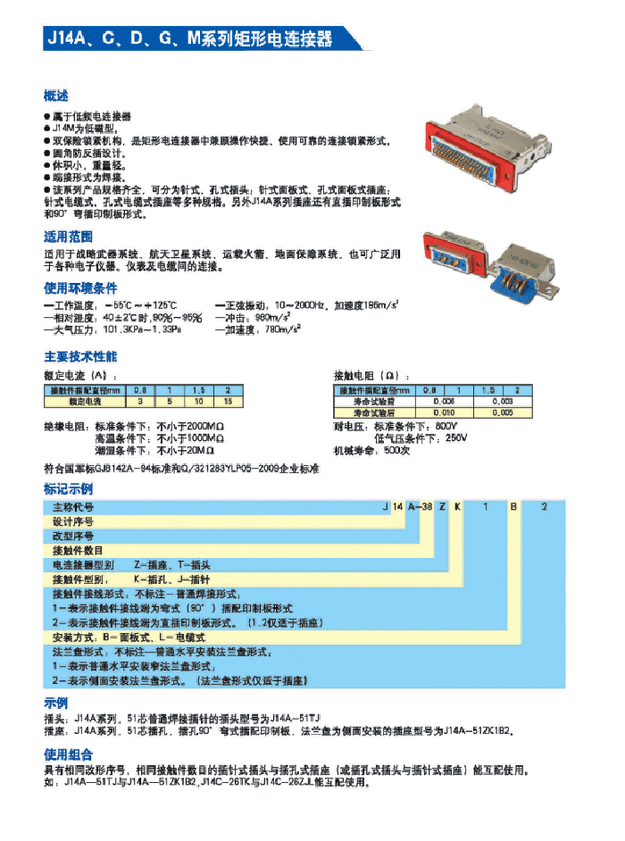 J14A-20ZK1B2/TJL矩形航空插頭,是符合GJB142A-94標準,屬于低頻電連接器。J14A是主稱代號,20表示接插件數目,Z表示插座,K表示插孔,K1表示接觸件接線端為彎式(90°)插配印制板形式。B2表示側面安裝法蘭盤插座。
