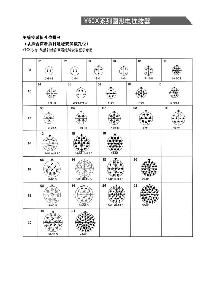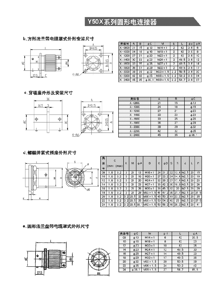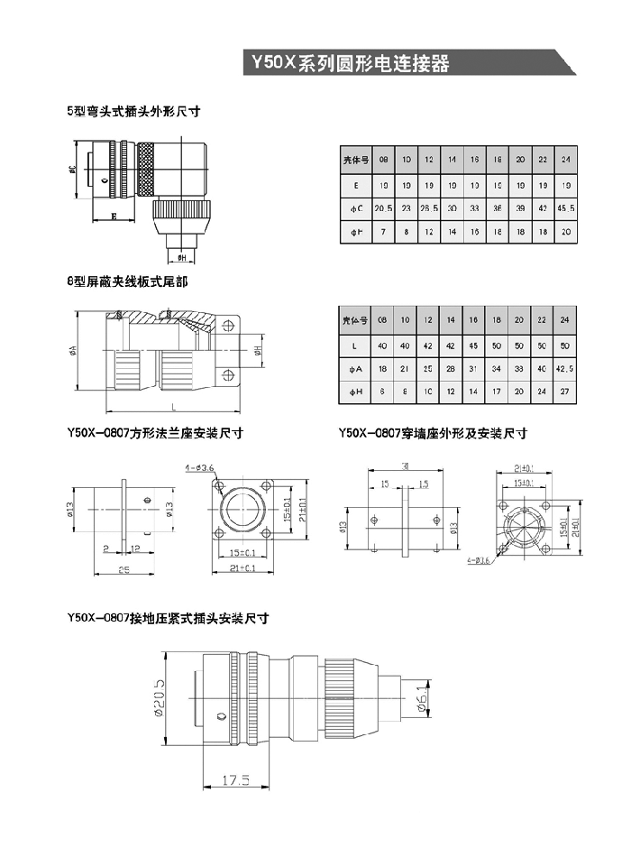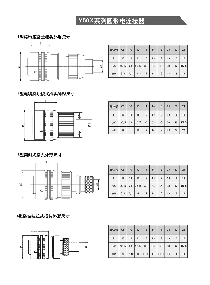Y50系列航空插頭包括公制、英制、電源三大類電連接器。均為內(nèi)螺旋槽卡銷鎖緊式。具有快捷連接與分離,體積小、重量輕,密封性能好,抗拉性能優(yōu)之特點(diǎn)。插頭電纜罩有七種安裝方式,殼體分屏蔽與非屏蔽,電纜引出有直式和彎式,端接方式為焊接式。品種多,規(guī)格全。Y50X是公制航空插頭,相對(duì)體積要大些。而且該產(chǎn)品可根據(jù)用戶需求改裝成濾波連接器,真空氣密封連接器。 均參照GJB101A—97,GJB598A—96,MIL—C—26482等標(biāo)準(zhǔn)的要求。適用于戰(zhàn)略、戰(zhàn)術(shù)系統(tǒng),野外作業(yè)等電訊號(hào)、電能的連接。