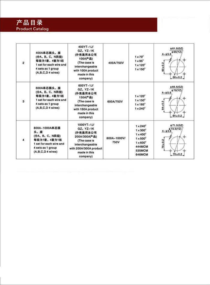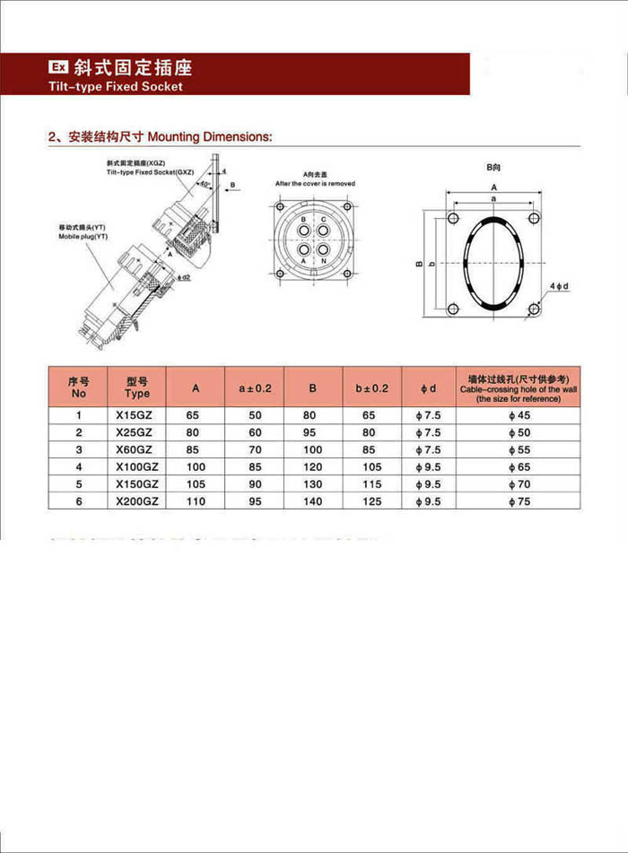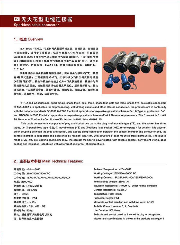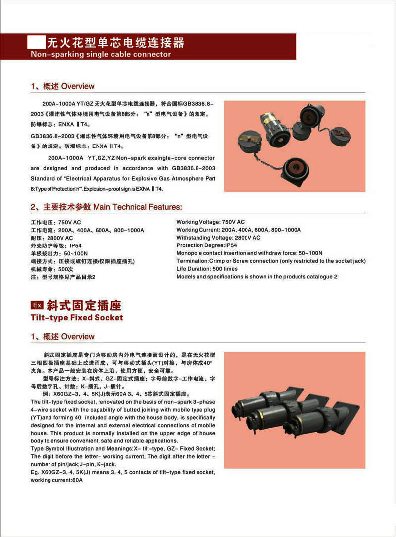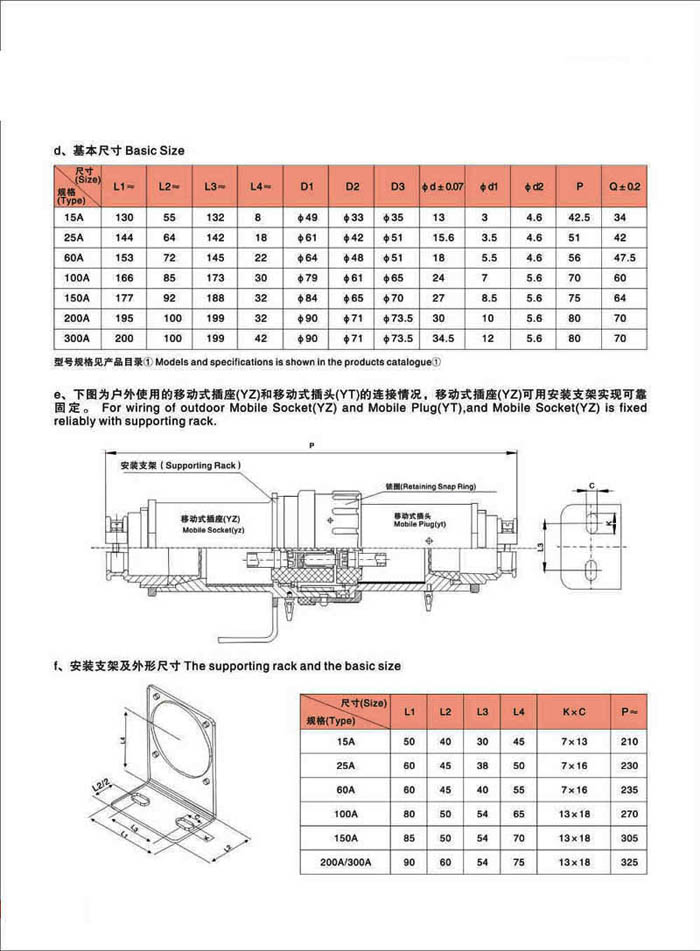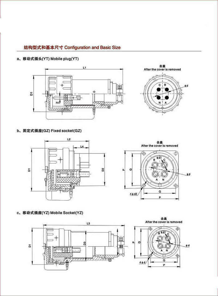 該系列產(chǎn)品由插頭和插座兩部分組成,其中插頭為移動式(YT),插座有3種形式選擇:①面板固定式(GZ)、②移動式(YZ)和③斜式固定式。