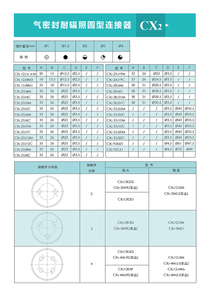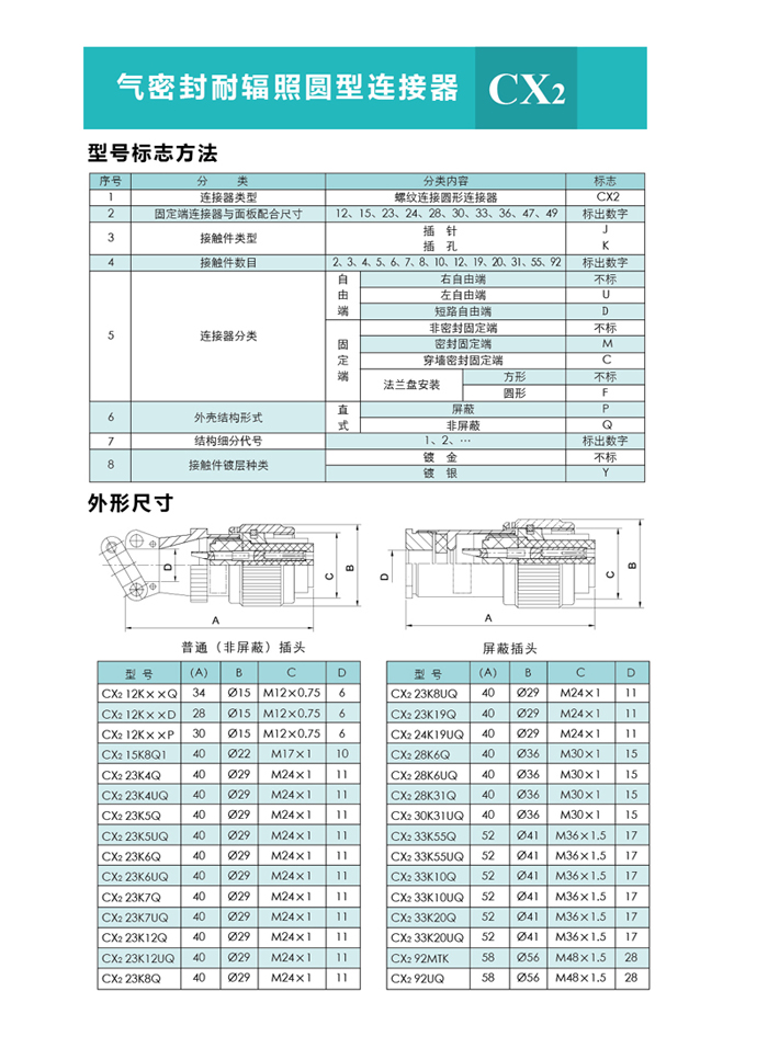 CX2系列8芯真空密封插座目前有七個殼體號,二十九個孔組數,有非密封、密封和密封穿墻等品種。尾部附件有直式壓線式、護線管式、彎式壓線式和屏蔽式四個品種;除以上四種形式的尾部附件外,還設計了 種尾部附件形式,供用戶選用。