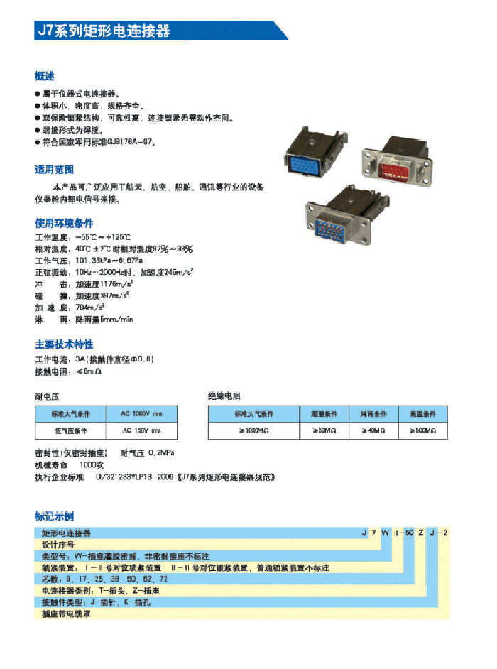 J7系列矩形航空插頭,認(rèn)證采用的國(guó)家標(biāo)準(zhǔn)為GJB 176-86《耐環(huán)境線簧孔矩形電連接器總規(guī)范》。連接方式為直插連接,使用方便,可快速插拔。帶有獨(dú)特的雙重鎖緊機(jī)構(gòu),防雨,外殼屏幕,插座灌膠密封, 密封性(僅密封插座)耐氣壓0.2Mpa。體積小,重量輕。插孔采用高可靠性能插孔,插拔力小,使用壽命長(zhǎng)。 J7系列矩形電連接器適用于各種電子儀器、電氣設(shè)備系統(tǒng)之間的電路連接。